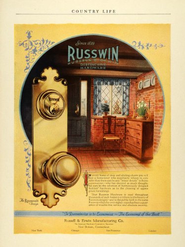 This is an original 1924 color print ad for Russwin Distinctive Hardware by the Russell and Erwin Manufacturing Company of New Britain, Connecticut. This particular ad features an image of the Roosevelt design..../ 1924 Ad Russwin Distinctive Hardware Russell Erwin Door Handle Roosevelt Design - Original Print Ad / Door Decor